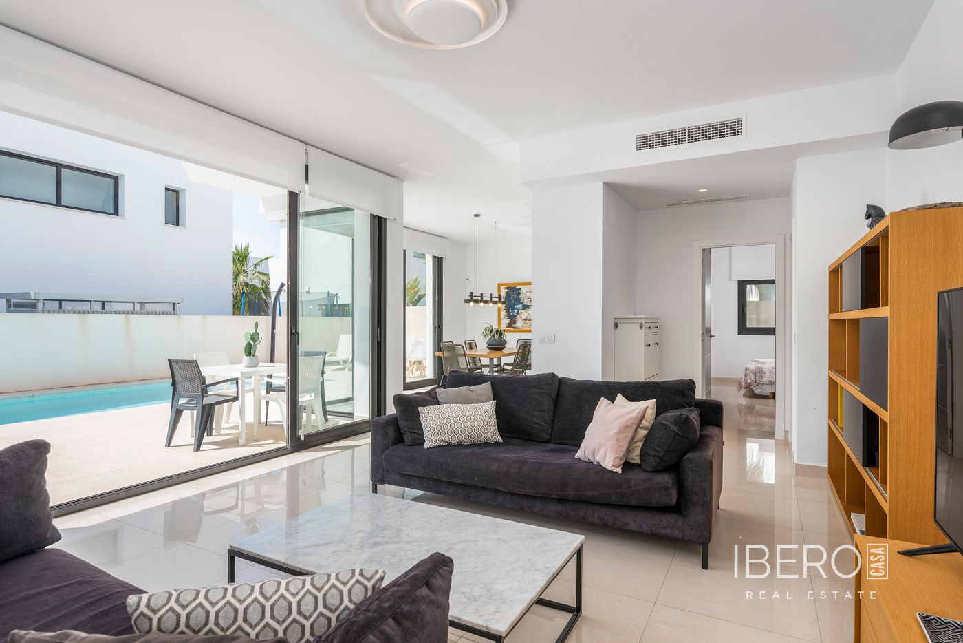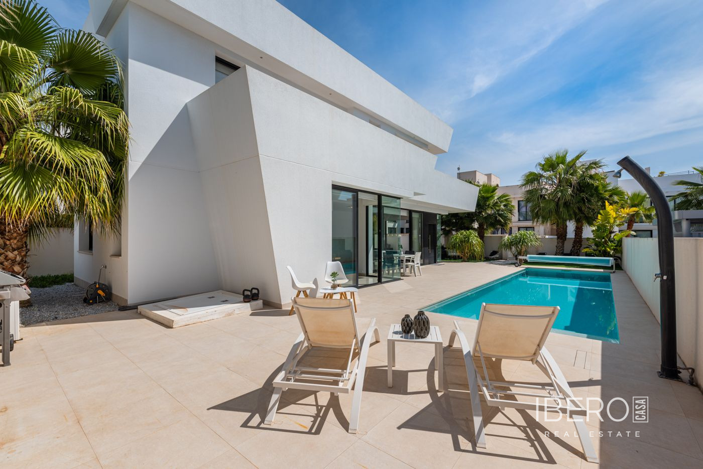 Vila se nachází v klidné části Ciudad Quesada, několik kilometrů od pobřeží. Rozloha pozemku, na kterém se nemovitost nachází, je 400 m2 a obytná plocha samotné vily je 185 m2 a skládá se ze dvou podlaží - přízemí a prvního patra. V přízemí se nachází prostorný obývací pokoj, jídelna s kuchyní, prádelna, 2 koupelny a ložnice. Z obývacího pokoje, kuchyně i jídelny je výhled do zahrady a na bazén, díky čemuž je tato část domu nádherně prosvětlená a interiér je velmi světlý. Přístup do prvního patra je po schodišti a jsou zde 2 koupelny, 3 ložnice a 2 velké terasy, na které lze vstoupit ze dvou nezávislých ložnic. Dům je plně vybaven velmi kvalitním nábytkem, domácími spotřebiči a koupelnovým zařízením a celá nemovitost je také klimatizována. Vila je zařízena v moderním stylu a díky mnoha prosklením a doplňkům je její interiér prostorný a zároveň útulný.Venkovní prostoryOkolí nemovitosti tvoří nádherně upravená zahrada, která se vyznačuje četnými a zelenými rostlinami, udržovaná terasa, bazén a parkovací pozemek. Na terase můžete odpočívat na lehátkách a jíst jídlo. V prvním patře jsou také 2 velké balkony s výhledem na okolí Ciudad Quesada.OblastCiudad Quesada je útulné a oblíbené místo na pobřeží Costa Blanca. Najdete zde obchody, restaurace, kavárny, bary, lékárny, banky, kadeřnictví, lékařské a zubní služby a mnoho dalšího. Na hlavní ulici bylo nedávno postaveno útulné nákupní centrum s několika obchody. Ciudad Quesada nabízí také několik aktivit pro celou rodinu, například známé golfové hřiště La Marquesa, bowling, minigolf, tenisové kurty, fotbalové hřiště, tělocvičny, lázně, sezónní aquapark a mnoho dalšího.PlážeNádherné pláže pobřeží Costa Blanca leží jako perly na šňůře a v krátké vzdálenosti se dostanete na řadu pláží. Slavná 9 km dlouhá písečná pláž v Guardamar del Segura a pláž "Torrelamata" v La Mata jsou dvě nejbližší pláže, které se nacházejí asi 10-15 minut jízdy od Ciudad Quesada.KlimaCiudad Quesada je ideálním místem pro život a krásným místem pro trávení léta. Léto je zde vždy slunečné a teplé, zatímco zimy jsou mírné a průměrná teplota v této oblasti dosahuje 20 stupňů. Ciudad Quesada je obklopena dvěma velkými solnými jezery, která mají očistný účinek na ovzduší a přispívají k tomu, že je zde mimořádně příznivé zdravotní prostředí. Podnebí má pozitivní vliv zejména na osoby trpící astmatem, alergiemi, revmatismem a kožními chorobami. Podle lékařské vědy patří oblast díky solným jezerům k nejzdravějším místům na světě.NakupováníV Ciudad Quesada najdete řadu obchodů, supermarketů, restaurací a barů. V Torrevieji, která je vzdálená přibližně 10 minut jízdy autem, najdete nákupní centrum Habaneras a Carrefour. V Torrevieji se nachází také nákupní ulice s řadou obchodů. Ve vzdálenosti 10 km se nachází velké nákupní centrum Zenia Boulevard, kde najdete obrovské množství obchodů, jako jsou Zara, Massimo Dutti, H&M, Stradivarius, Oysho, Mango, Primark, Pull & Bear, Decathlon, Guess, Kiko, Druni, Rituals, Leroy Merlin a mnoho dalších.GolfV Ciudad Quesada najdete známé golfové hřiště "La Marquesa Golf & Country Club". V okolí se nachází řada golfových hřišť a v okruhu 15 kilometrů najdete Las Colinas Golf & Camp; Country Club, La Finca Golf, Golf Las Ramblas Golf Villamartín, Lo Romero Golf, Vistabella Golf, Real Clud de Golf Campoamor a Greenlands Golf.Jachting a vodní sportyV okruhu 20 kilometrů se nachází několik jachetních klubů a přístavů. V Torrevieji najdete tři, jeden je v Guardamar del Segura a dva v Santa Pola. Najdete zde školy plachtění, windsurfingu a potápění, abychom zmínili alespoň některé. Na několika místech v oblasti si můžete půjčit prkna pro SUP (stand up paddle-boarding) a na řadě pláží se můžete věnovat vodním aktivitám, jako je fly-boarding, jízda na banánu, vodní skútry a další.Nemocnice a zdravotní péčeV Torrevieji se nachází moderní veřejná nemocnice s vynikající pověstí. Soukromá nemocnice Hospital Quiron se nachází rovněž v Torrevieji. Laguna Mar Menor, která se nachází asi 30 minut jízdy od Ciudad Quesada, je jednou z největších evropských lagun se slanou vodou a maximální hloubkou přibližně 7 metrů. Vysoká slanost vody zajišťuje mikroklima, které je velmi zdravé, zejména pro lidi se srdečními problémy, artritidou nebo plicními chorobami. Slaná bahenní lázeň je známá také díky úlevě od kožních onemocnění, jako je lupénka, a je doporučována několika odborníky.Jak se tam dostatCiudad Quesada se nachází přibližně 40 minut jízdy autem od letiště v Alicante i Murcii / San Javieru. Z Ciudad Quesada se lze snadno dostat do velkých měst v oblasti po dálnici A-7 nebo pobřežní silnici N-332, například do Elche, Alicante, Valencie, Murcie a Cartageny.